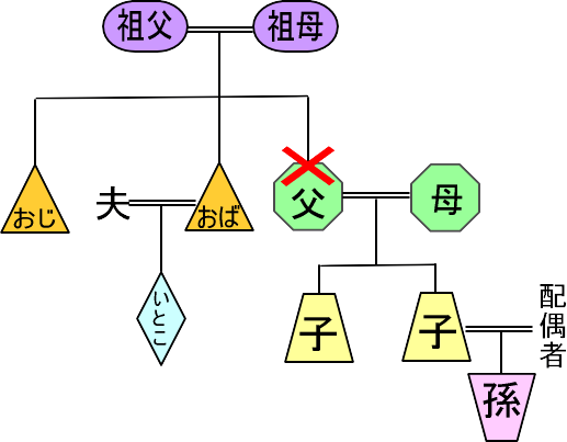⑥父が亡くなる前に祖父母、おば、子、孫全て亡くなっており、母とおじといとこが健在の場合